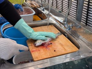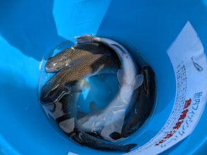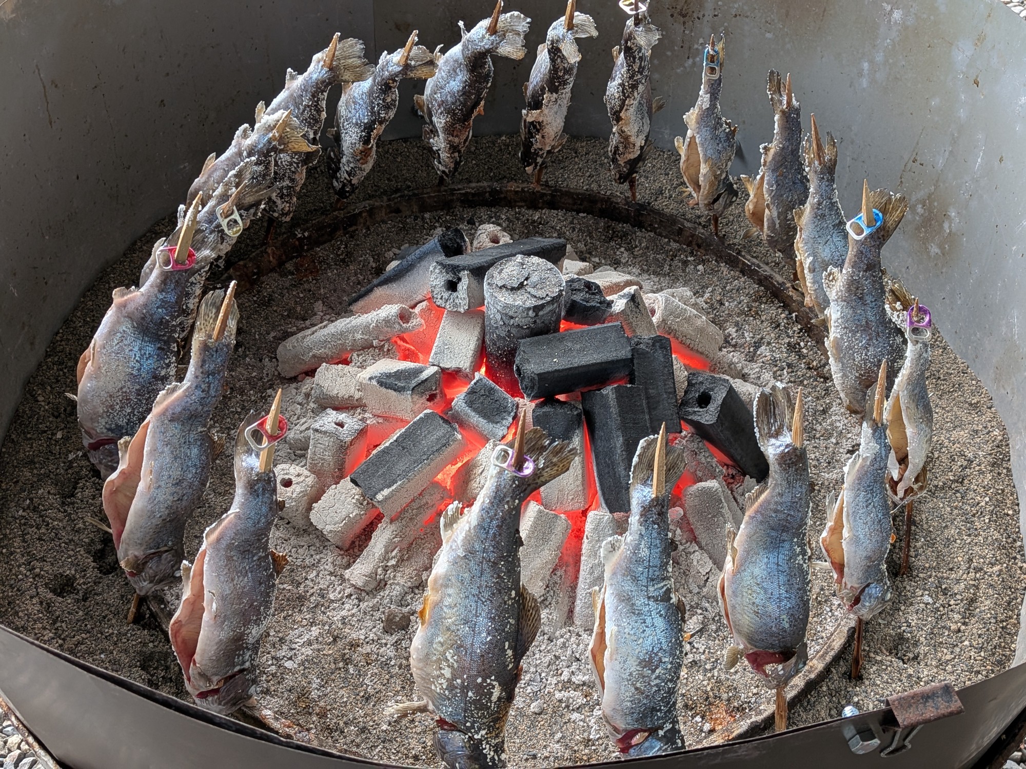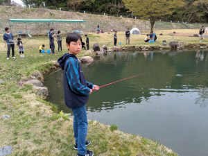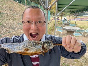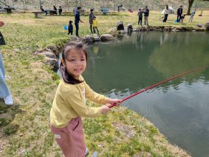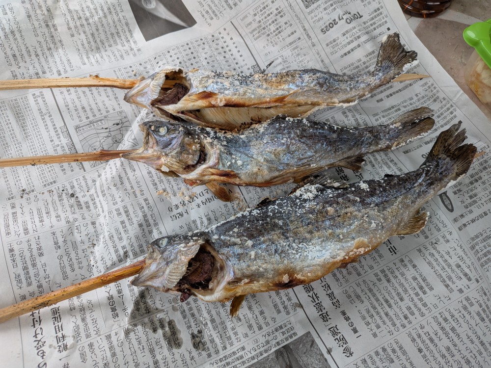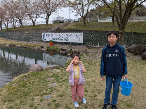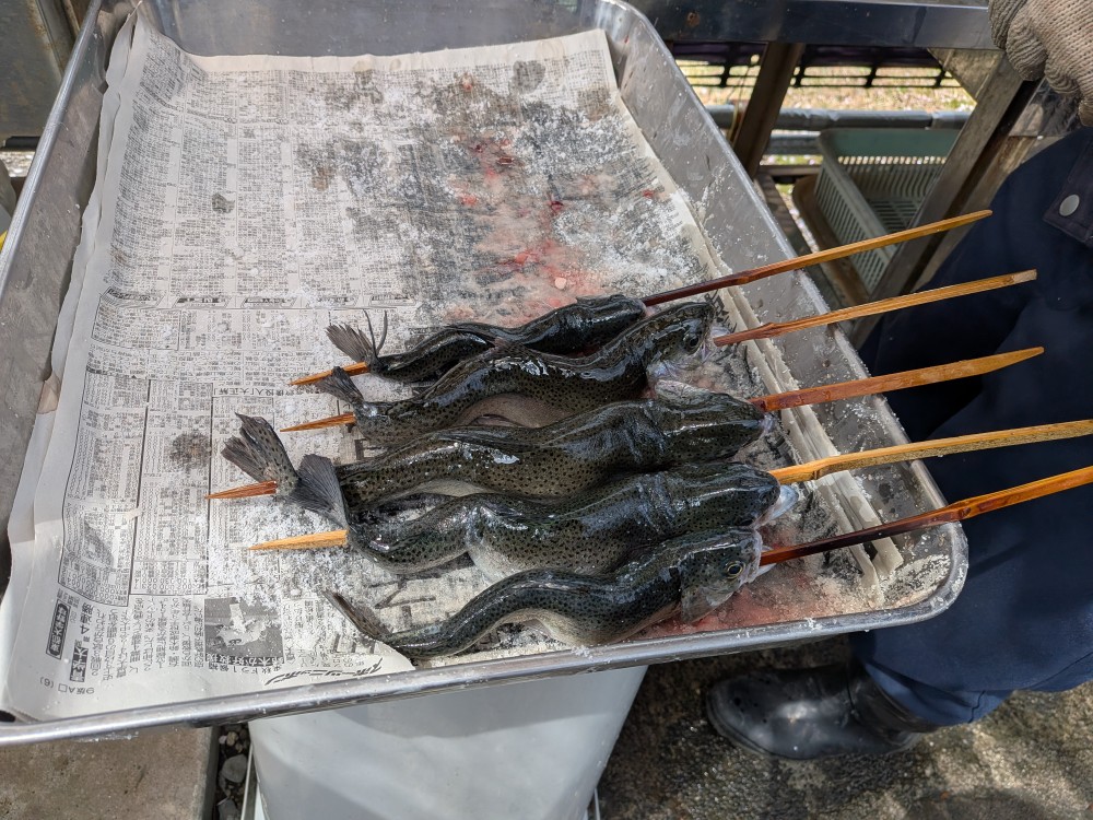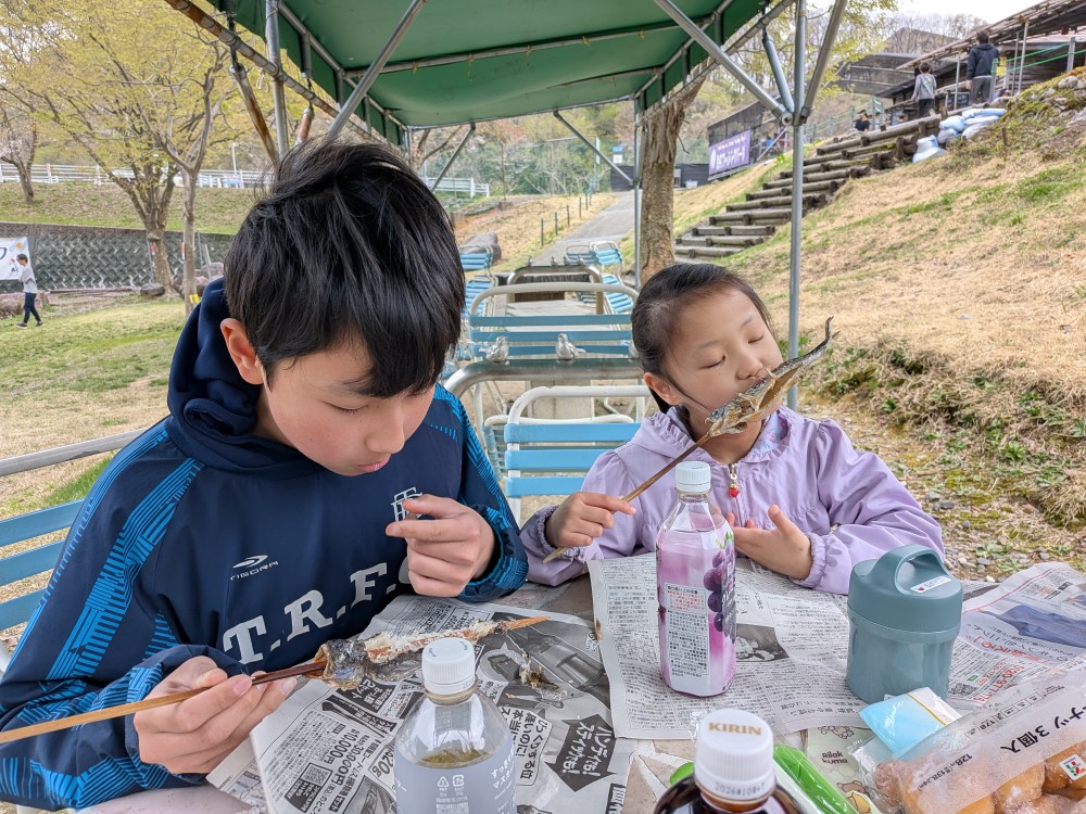 お兄ちゃんが中学に上がり🏫部活やら何やらで、なかなか時間が合わないが💦土曜日の今日はバッチリ予定が合いました✨久々に家族サービス💓(*´з`)胎内フィッシングパーク🐟今日4月18日からオープンだそうで💡放流したて「まるまる太ったニジマスとイワナ」が居るそうな🎵✨お店に方曰く【今日1番の大物🐟】引きが強かったもんね🎣チビちゃんには刺激が強かった❓かも知れませんが💦命の勉強📝チビちゃん曰く「死んでるのに動いてるよぉ🐟」←(捌いたのにピクピク動いてるよぉ🎵の意)串に刺してもらって自分で焼くスタイル🔥背中を40分・左右を5分ずつ⏰最後にお腹側を20分🔥おぉ~こんがり香ばしい。皮がパリパリ・身がふっくら🐟お魚さんに感謝して「お命を有難く頂戴させていただきますm(__)m普段は骨を取るのが面倒で、あまり食べない子供達ですが…いつもと違い丁寧に食しています🔎お父さんもニジマスさんに感謝💓美味しく頂きました🐟