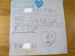 感謝の気持ち💌 チビちゃんからのラブレター💌✨おとうさんへいつも〇〇たちのためにはただいたりして おきょうもみんなのために がんばってくでてありがとう❣本田〇〇より 本田ぎしょう💓チビちゃんありがとう🎵おとうさんも こでで頑張でるよ(*‘ω‘ *)あとで「ら・れ」直そうね( ..)φ カテゴリー: 未分類 投稿日: 2026年03月15日